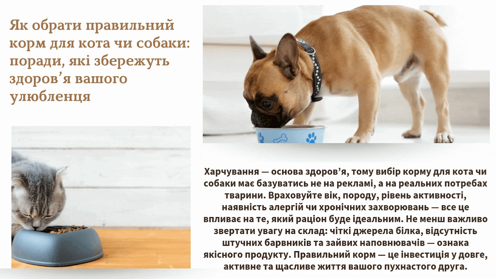 Вибір корму — це не просто “що подобається тварині”, а відповідальне рішення, яке впливає на роки її життя. Не обирайте наосліп — дізнавайтесь, аналізуйте, тестуйте. Орієнтуйтесь на склад, а не на брендову упаковку. Враховуйте вік, вагу, активність, хронічні хвороби. Поступовість і спостереження — ваші найкращі помічники. Головне — не ігнорувати сигнали організму тварини: вони завжди щось підказують. Збалансоване харчування — це профілактика, а не лікування. І коли ваш улюбленець здоровий, активний і щасливий — це найкраще підтвердження, що ви обрали правильно.